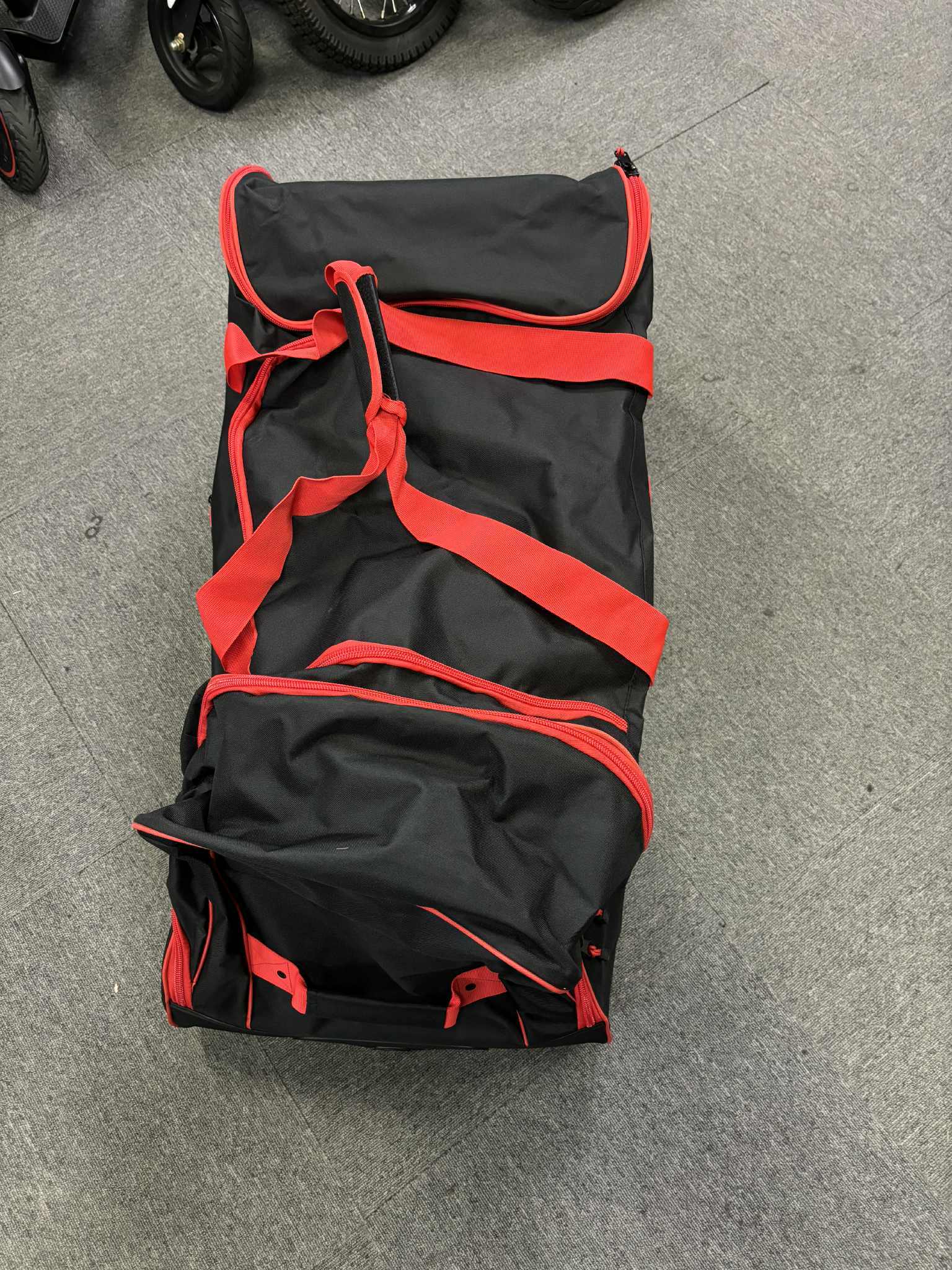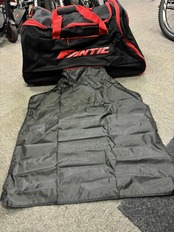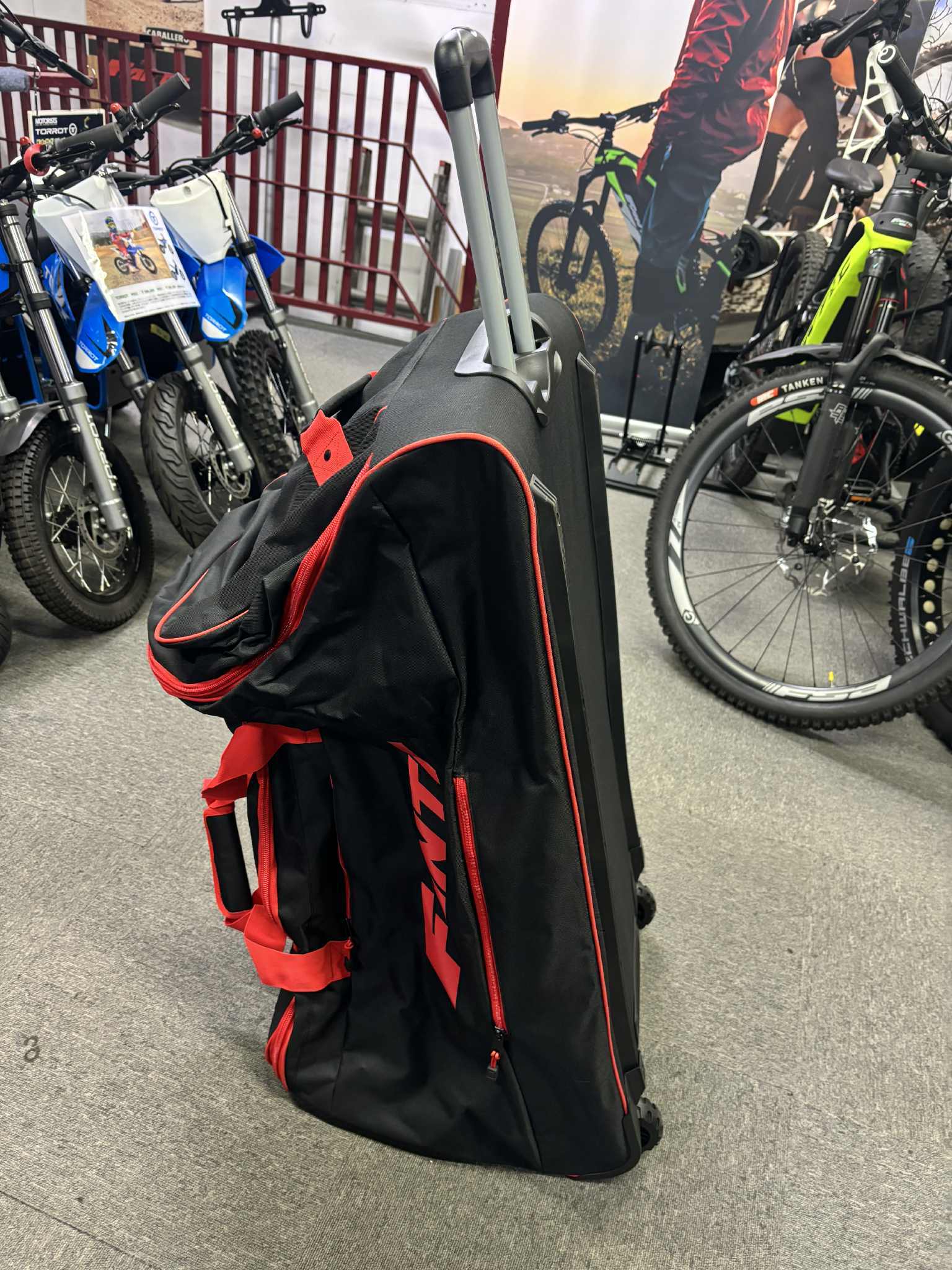 キャリーハンドル、大型のキャリーホイール、背面はプラスティック製ハードシェル。サイドには折り畳み式のチェンジングマット(着替えの時に靴を脱いで立てるように用意されるマット)が収納されています。黒字の赤でファンティックのロゴ入りですが、シンプルで鮮やかなデザインはファンティックライダーでなくても際立った存在感を見せられるでしょう。