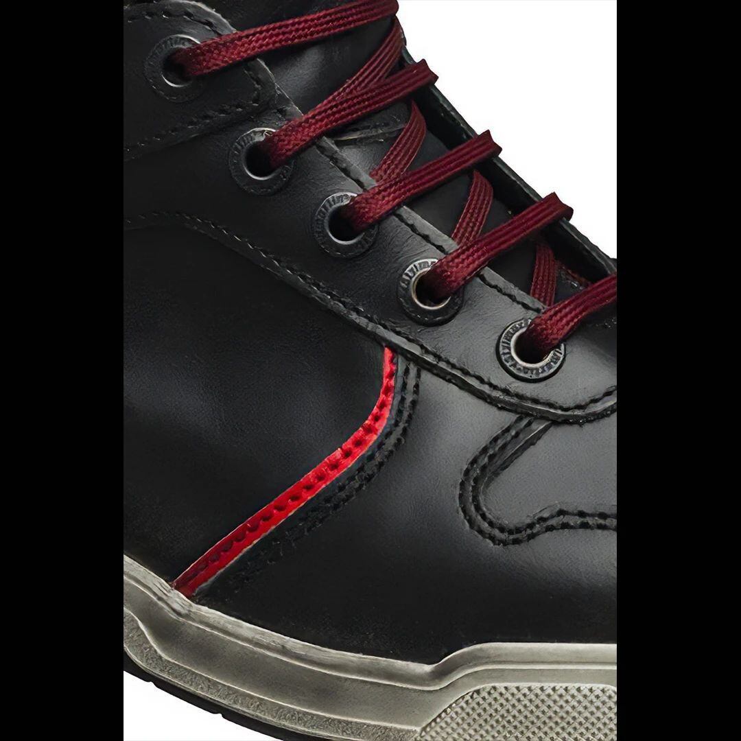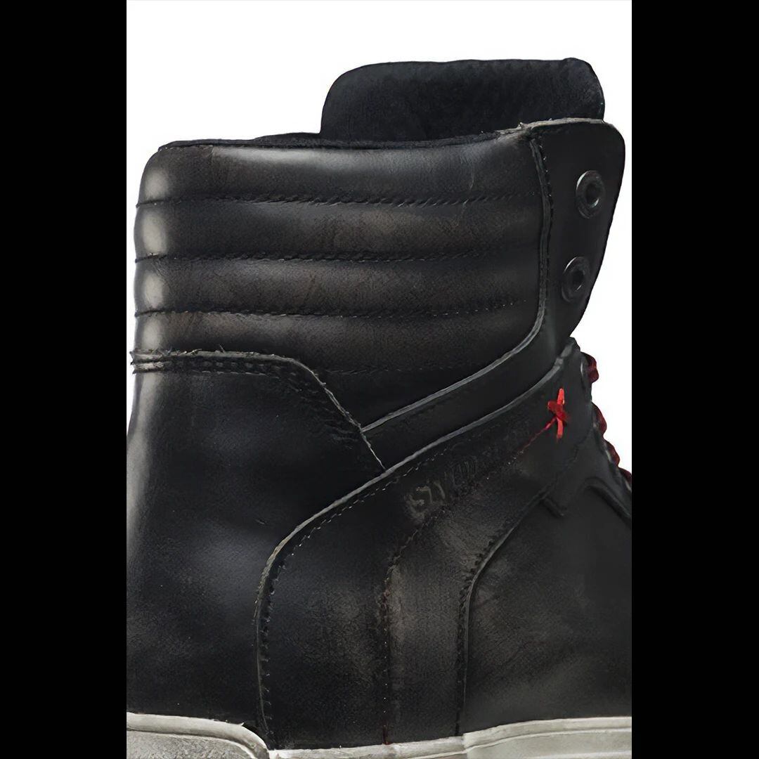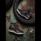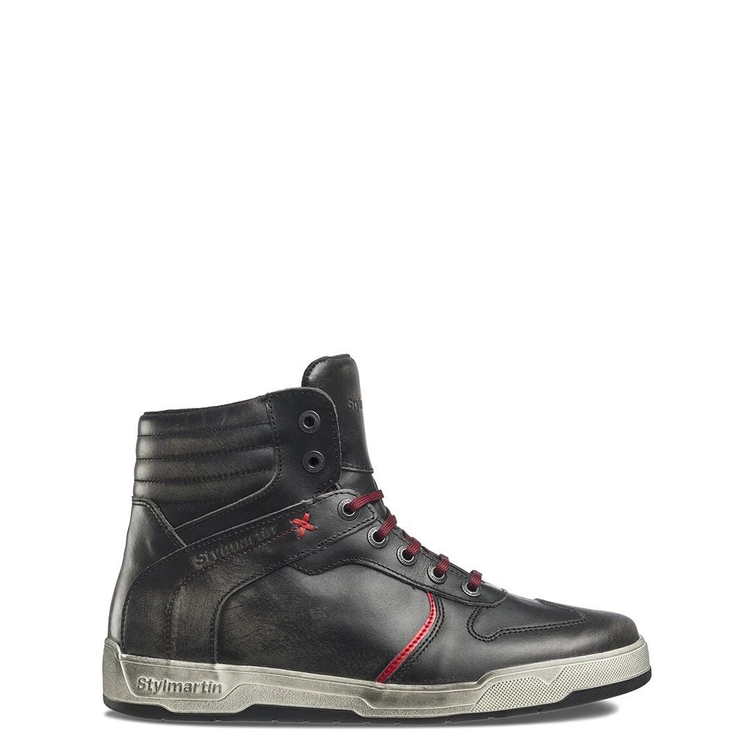 IRON(アイアン)シリーズは、スティルマーチンの多彩なスニーカーの中でも、ビンテージ・スタイルが魅力的な逸品です。防水加工を施したフルグレーン・レザーのアッパーには、スティルマーティンならではの「グラフィティ」処理が施され、凹凸のある傷がレザー表面に仕掛けられることにより不規則なニュアンスと陰影が美しく浮かび上がります。アウトソールはホワイトの側面とラバーの裏面を持つ凝ったデザイン。レッドのレース(靴ひも)がスタイルをさらに美しく締めあげますが、控えめなブラック・カラーのレースも付属しています。PUモールドされたくるぶしのプロテクターが安全性も担保しています。WPの名の通り、高い防水性も自慢のポイントです!