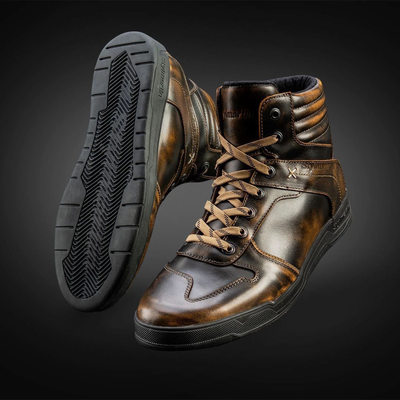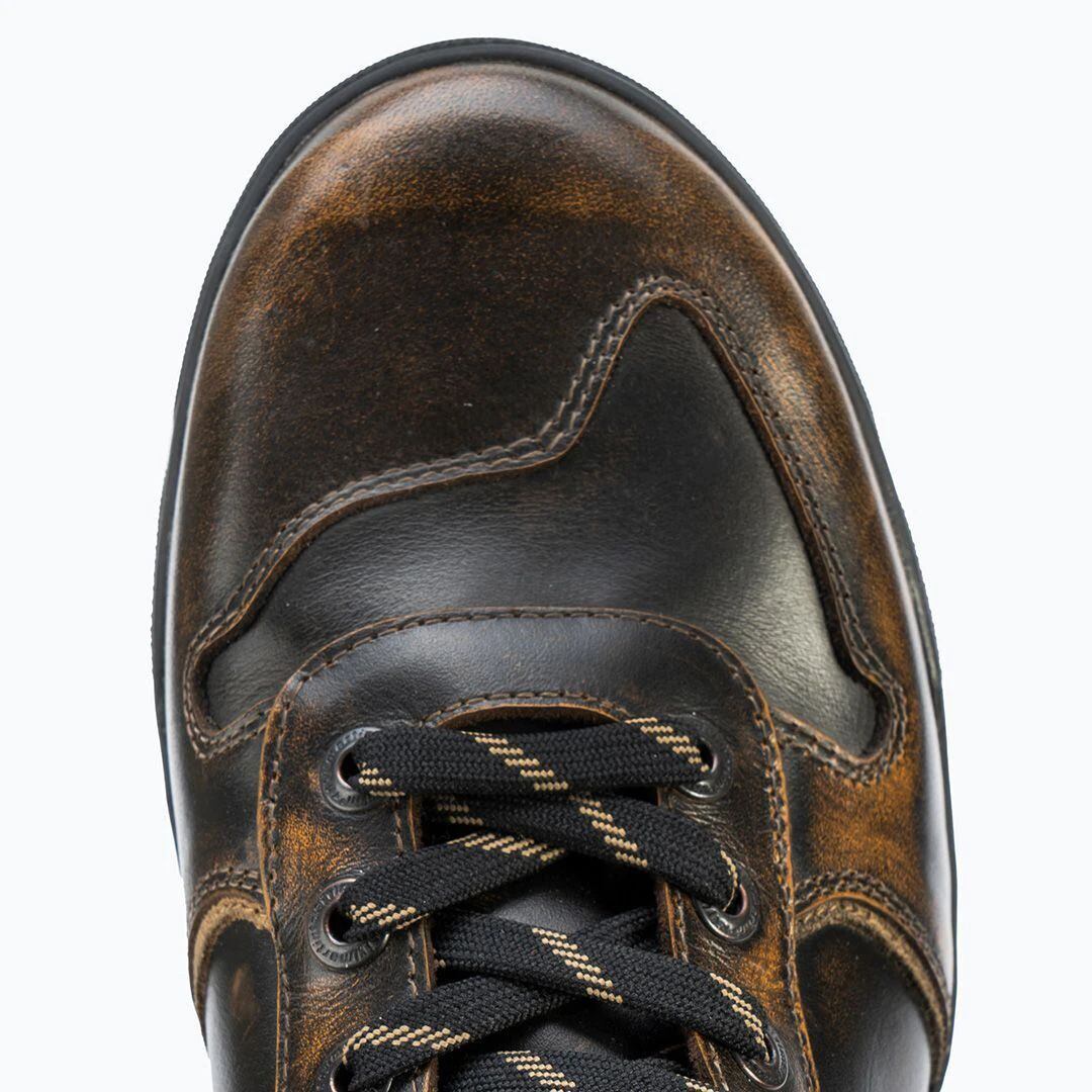 IRON(アイアン)シリーズは、スティルマーチンの多彩なスニーカーの中でも、ビンテージ・スタイルが魅力的な逸品です。防水加工を施したフルグレーン・レザーのアッパーには、スティルマーティンならではの「グラフィティ」処理が施され、凹凸のある傷がレザー表面に仕掛けられることにより不規則なニュアンスと陰影が美しく浮かび上がります。アウトソールはブラックですが、何と言ってもビンテージ感の強いアッパーが魅力ですね。レース(靴ひも)はブラック又はブラウンの2本が用意されていますから、お好みに合わせて選ぶこともできちゃいます。PUモールドされたくるぶしのプロテクターが安全性も担保しています。WPの名の通り、高い防水性も自慢のポイントです!